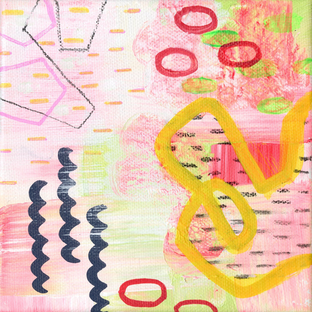 Acrylics, markers, and charcoal on canvas, 15 x 15 cm. Sold unframed.